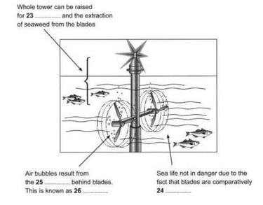 D A marine turbine blade needs to be only one third of the size of a wind generator to produce three times as much power. The blades will be about 20 metres in diameter, so around 30 metres of water is required. Unlike wind power, there are unlikely to be environmental objections. Fish and other creatures are thought unlikely to be at risk from the relatively slow-turning blades. Each turbine will be mounted on a tower which will connect to the national power supply grid via underwater cables. The towers will stick out of the water and be lit, to warn shipping, and also be designed to be lifted out of the water for maintenance and to clean seaweed from the blades.