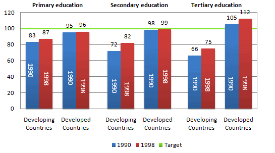 The chart below shows the number of girls per 100 boys enrolled in different levels of school education.