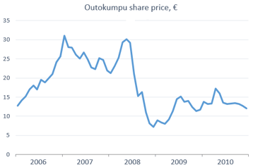 The line graph below shows the changes in the share price of Outokumpu companies in euros between January 2006 and December 2010.